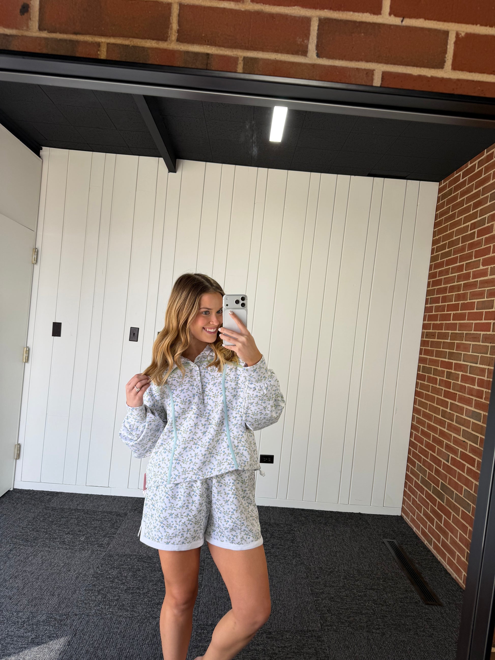 The Cinched Pullover Top features snap collar construction, long sleeves with cuffs, dropped shoulders, a relaxed fit, coordinated piping details, an adjustable cinched hem, and Simply Southern logo embroidery. Made of 48% modal, 48% polyester, and 4% spandex.