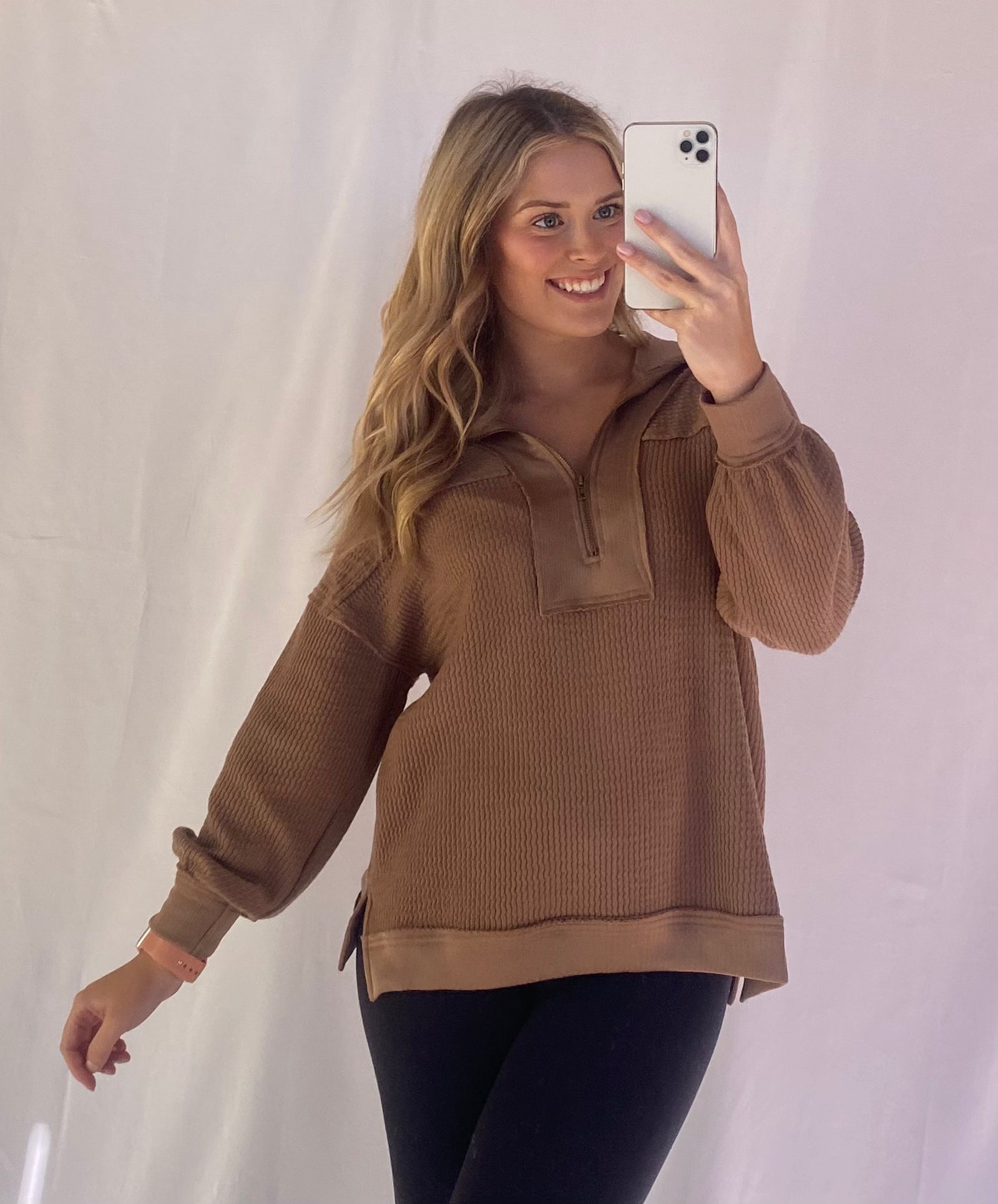 HALF ZIP COLLARED LONG SLEEVE WAFFLE KNIT TOP