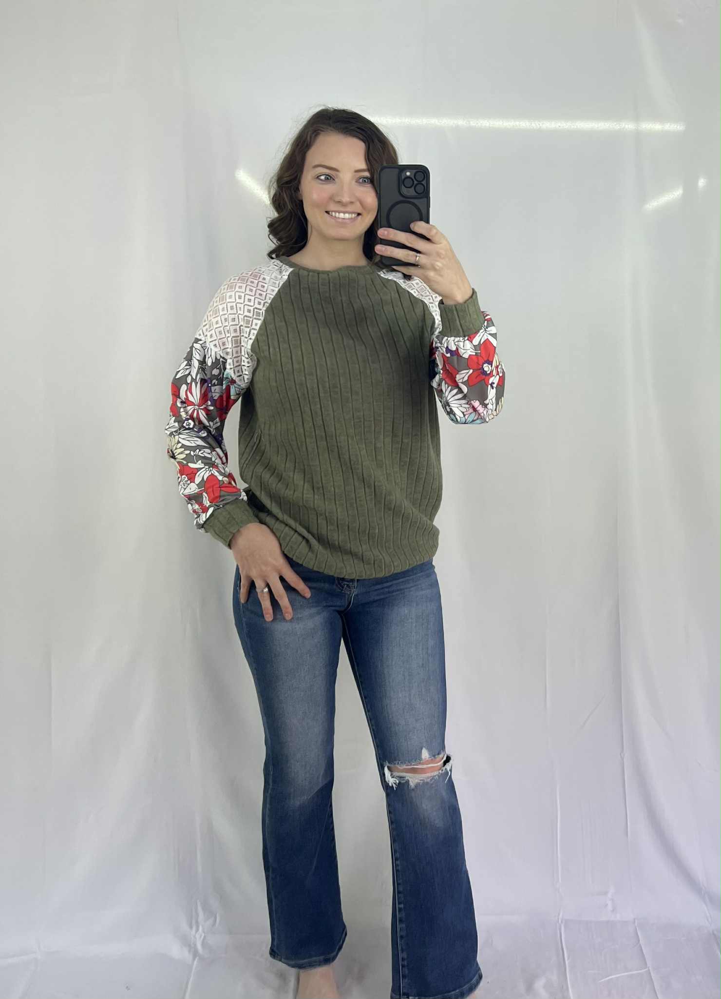 Add a touch of charm to your wardrobe with this Green Floral Patchwork Long Sleeve Ribbed Blouse. Featuring a mix of floral prints in earthy tones, this top blends feminine details with a cozy ribbed texture. The lightweight, stretchy fabric and long sleeves make it perfect for layering or wearing solo. Pair it with denim for a casual day out or dress it up with trousers for an elevated look.
