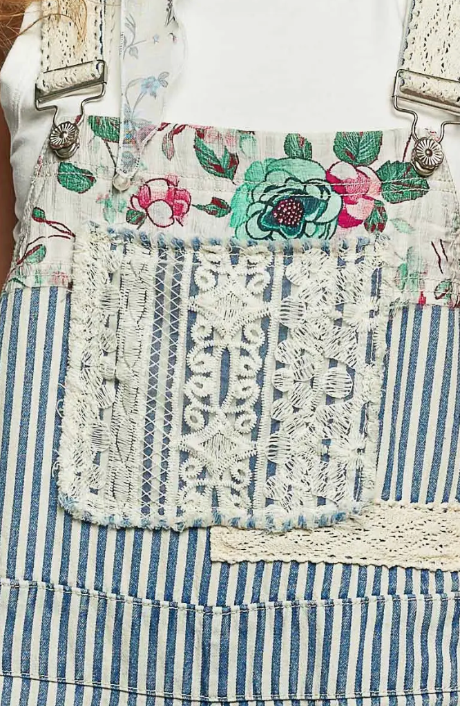 This jogger-style overall features a comfortably loose and relaxed silhouette, offering an easy and stylish fit. The straps include decorative trim details, while the bodice is accented with a combination of printed fabric and lace for a unique focal point. Additional printed and lace patches are placed along the legs, creating layered texture and enhancing the playful, handcrafted look.